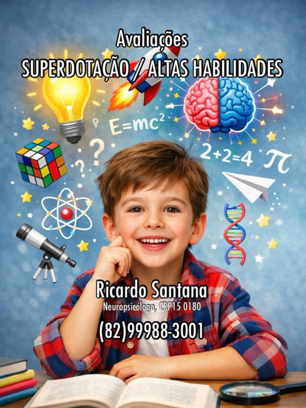 Oferecemos serviços especializados de avaliações de superdotação e altas habilidades, realizados por profissional qualificado em psicologia e neuropsicologia, com instrumentos técnicos e critérios científicos reconhecidos. A avaliação investiga áreas como raciocínio lógico, linguagem, memória, criatividade, atenção, desempenho acadêmico, habilidades socioemocionais e potencial intelectual acima da média, permitindo identificar talentos e necessidades específicas da criança. O processo inclui entrevistas com responsáveis, análise do histórico escolar, aplicação de testes padronizados e devolutiva detalhada, com orientações para a família e para a escola, favorecendo intervenções adequadas, enriquecimento curricular e o pleno desenvolvimento das potencialidades cognitivas e emocionais.